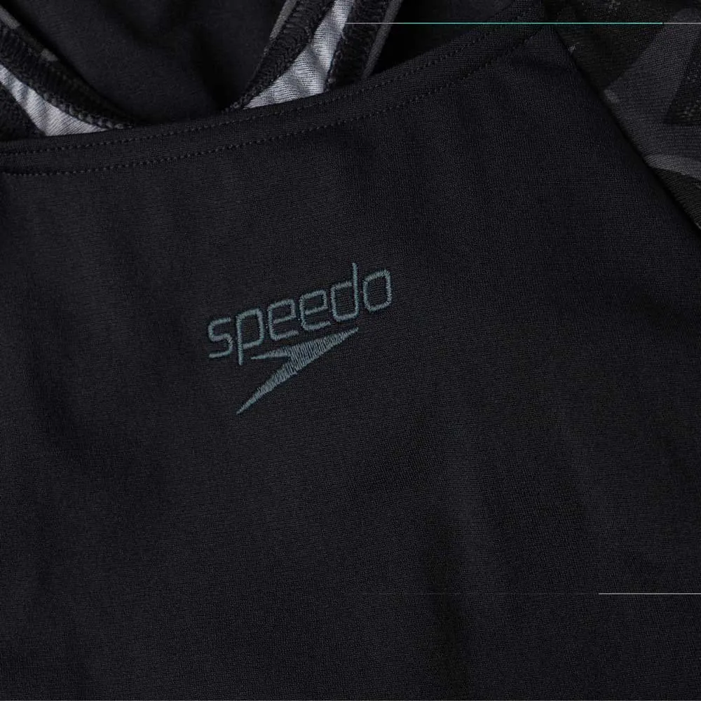 Celebrando il marchio Speedo, questo Muscleback sportivo presenta giunzioni del pannello laterale sagomate lusinghiere della nostra stampa del logo Boom “frantumato” in sorprendenti tonalità di grigio e nero.